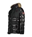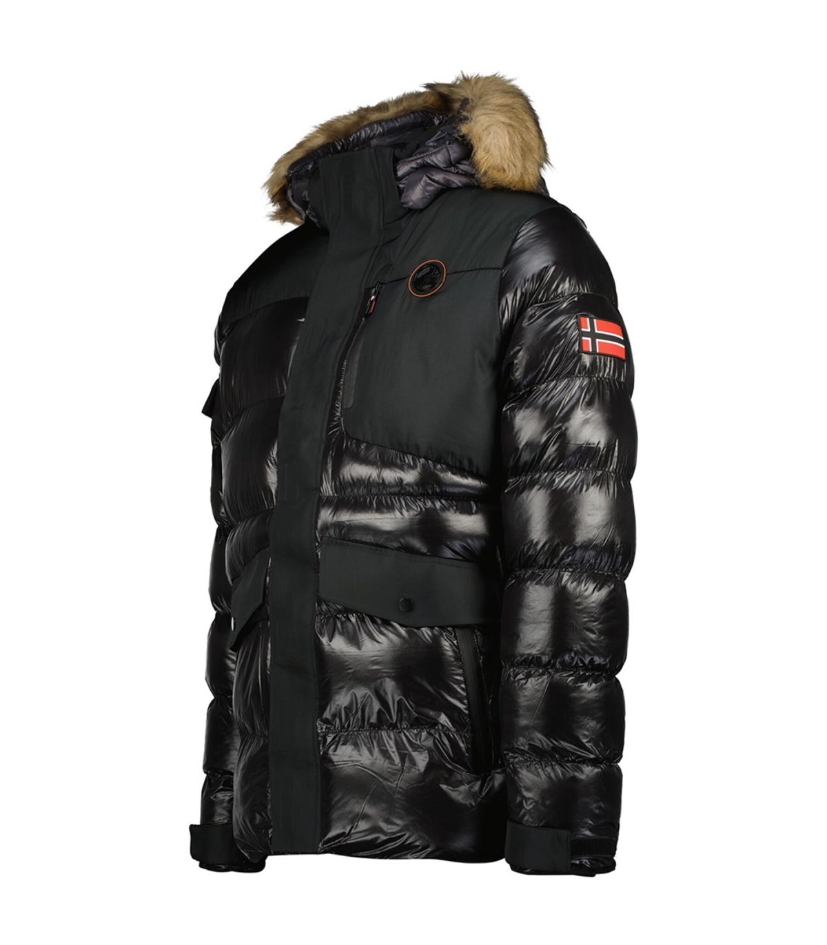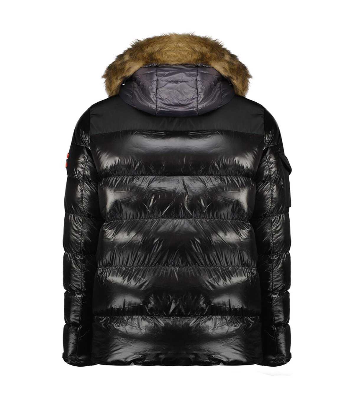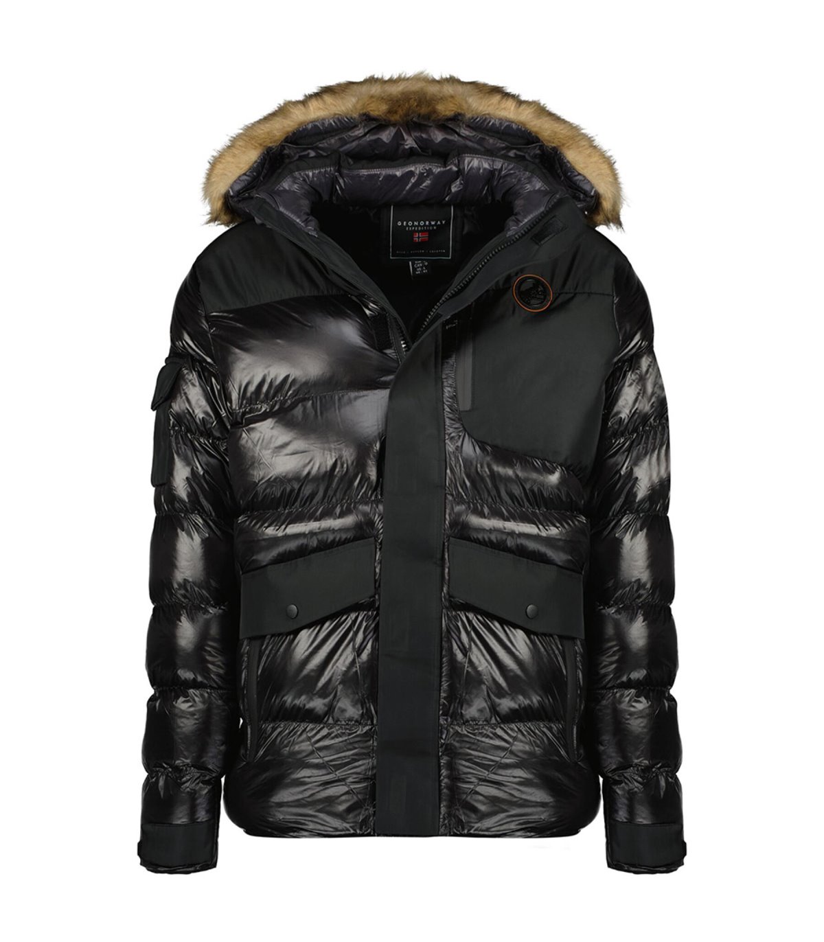 Chaqueta con capucha y pelo sintético desmontable. Bolsillos laterales.