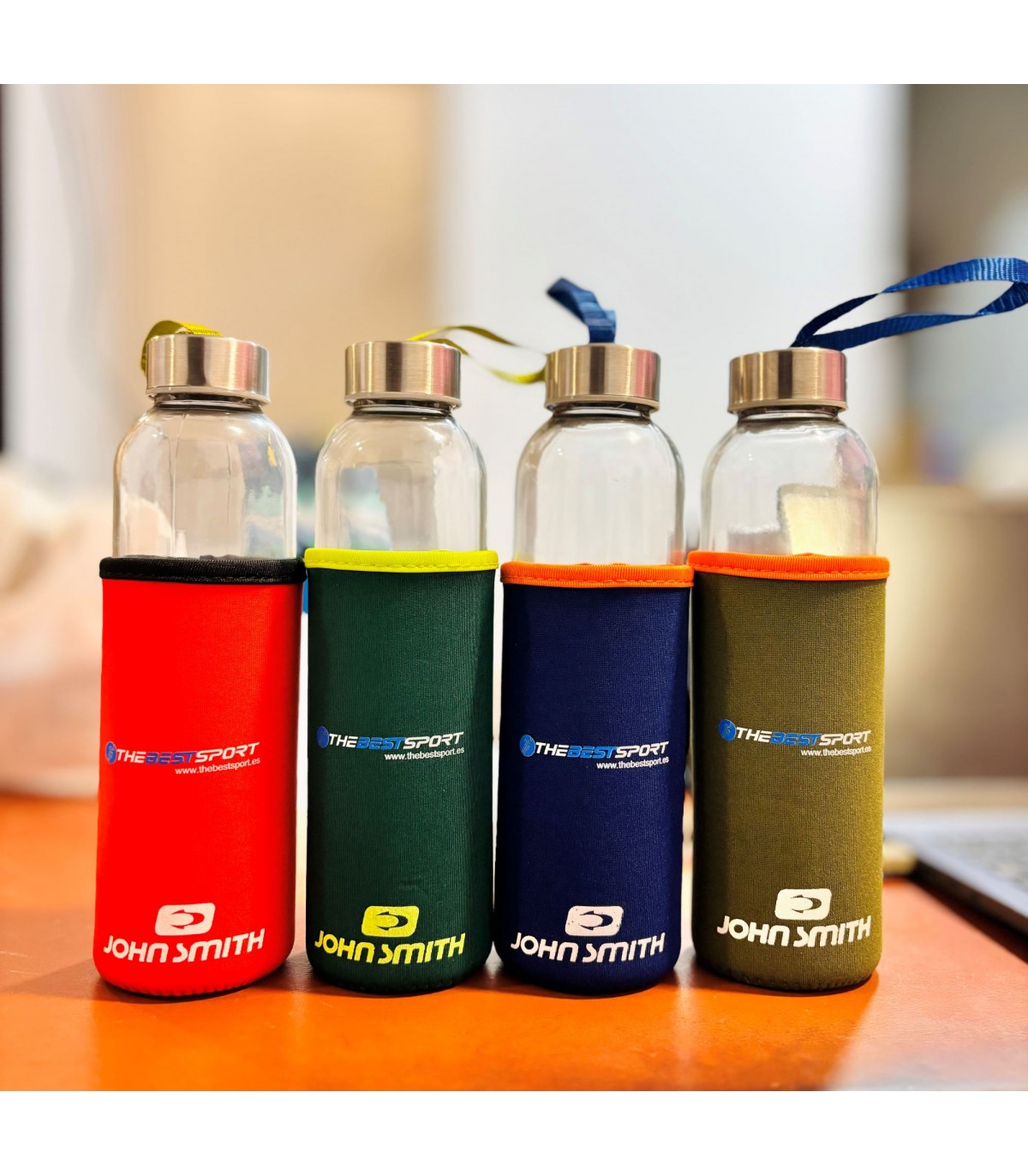 Botella de cristal para líquidos fríos o calientes. Personalizada con THE BEST SPORT.