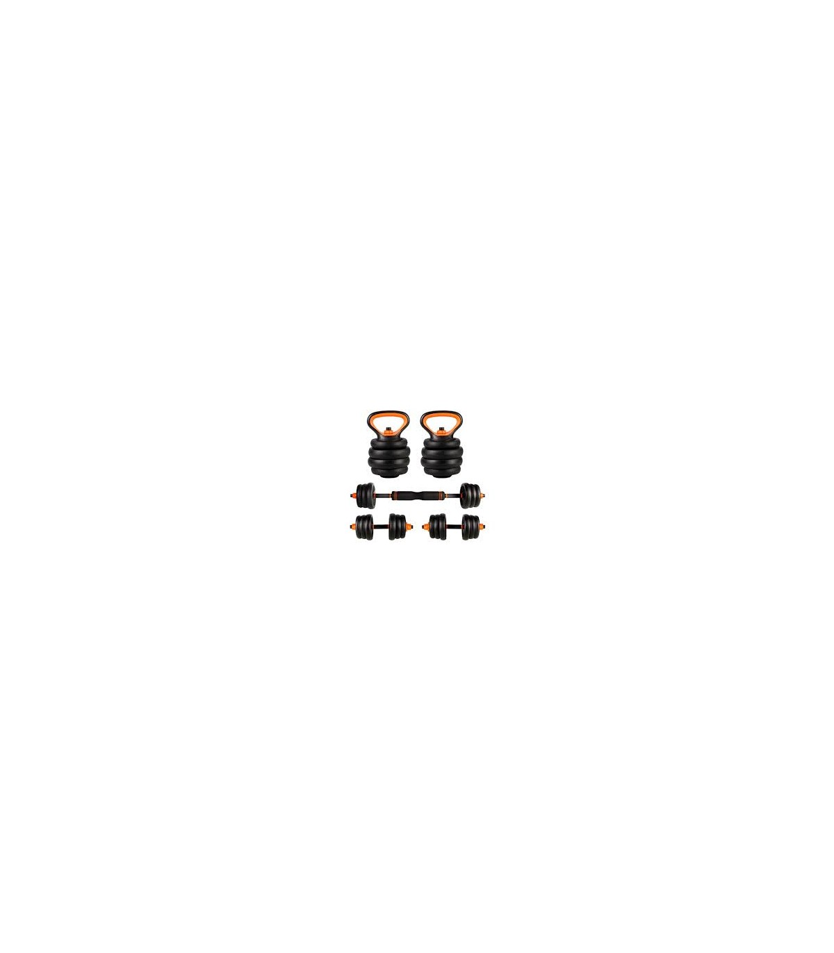 Incluye 2 barras de mancuerna de diámetro 28mm y largo 45cm; 2 agarres de kettlebells, una base, un tramo acolchado y 4 cierres de estrella.
