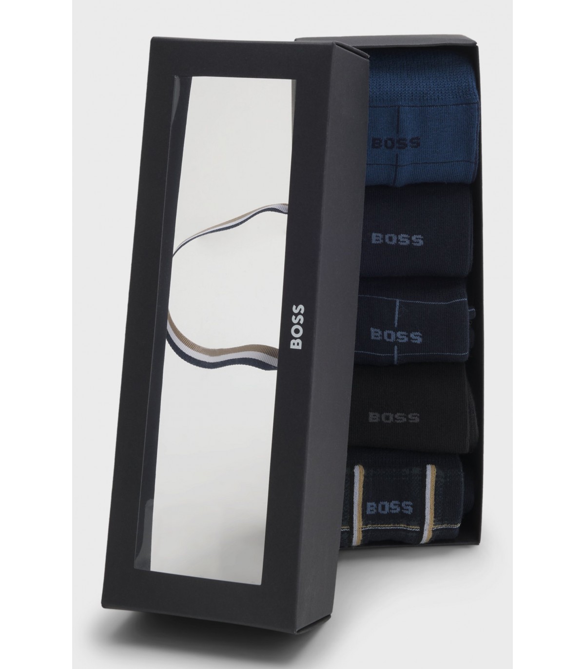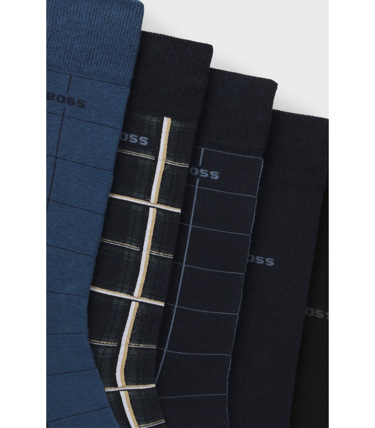 Estos cinco pares de calcetines BOSS Hombre de largo estándar para uso diario se entregan en una caja ideal para regalo. Cómoda mezcla elástica. Diseños lisos y a cuadros.