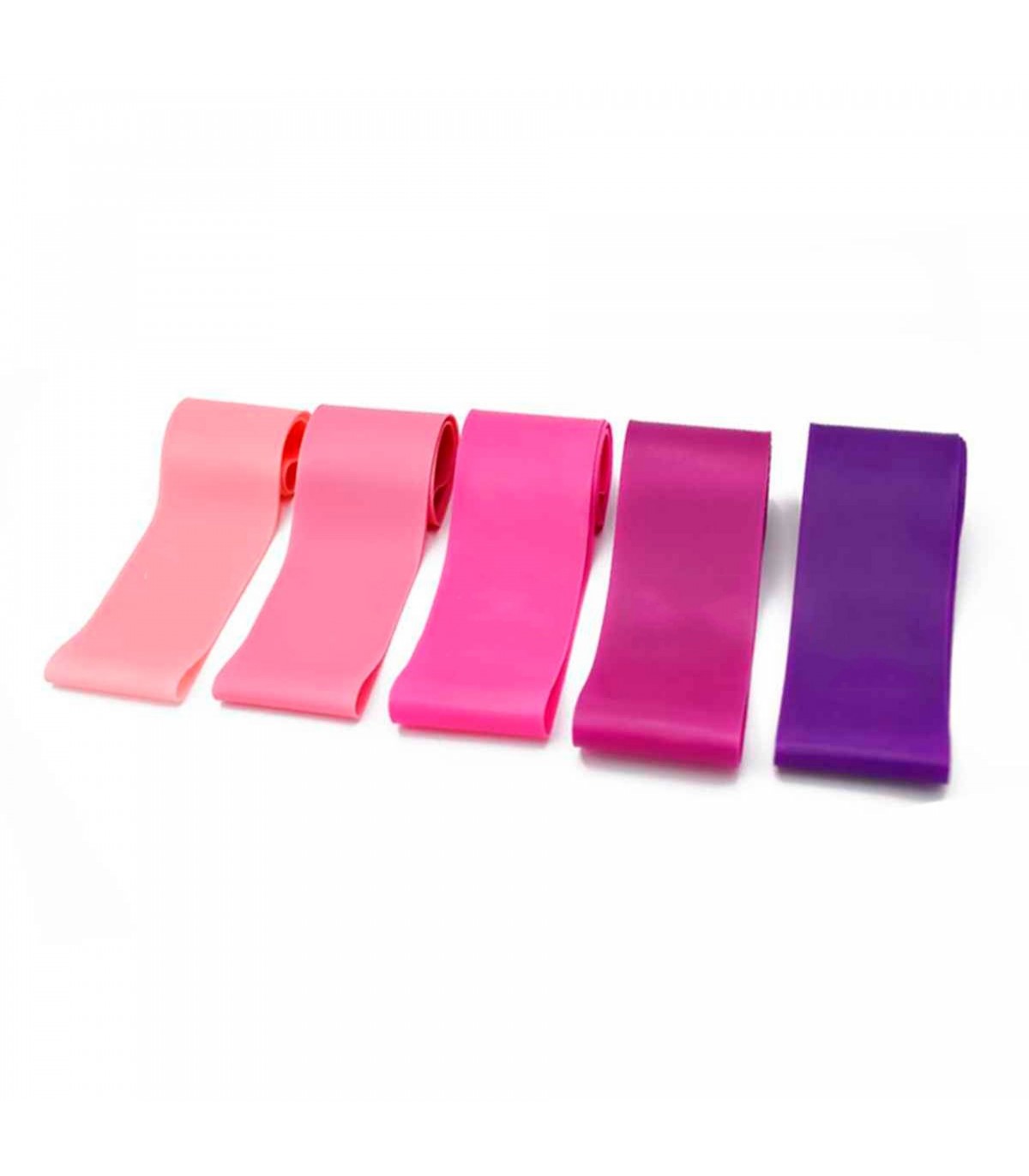 Set de bandas muy resistentes para entrenamientos de fuerza, resistencia, elasticidad... 5 niveles de trabajo en función del color: Púrpura - Fuerte II, fucsia - Fuerte I, rosa - Fuerte, rosa medio - Medio y rosa claro - Ligero. El set contiene 5 bandas y una bolsa para su transporte.